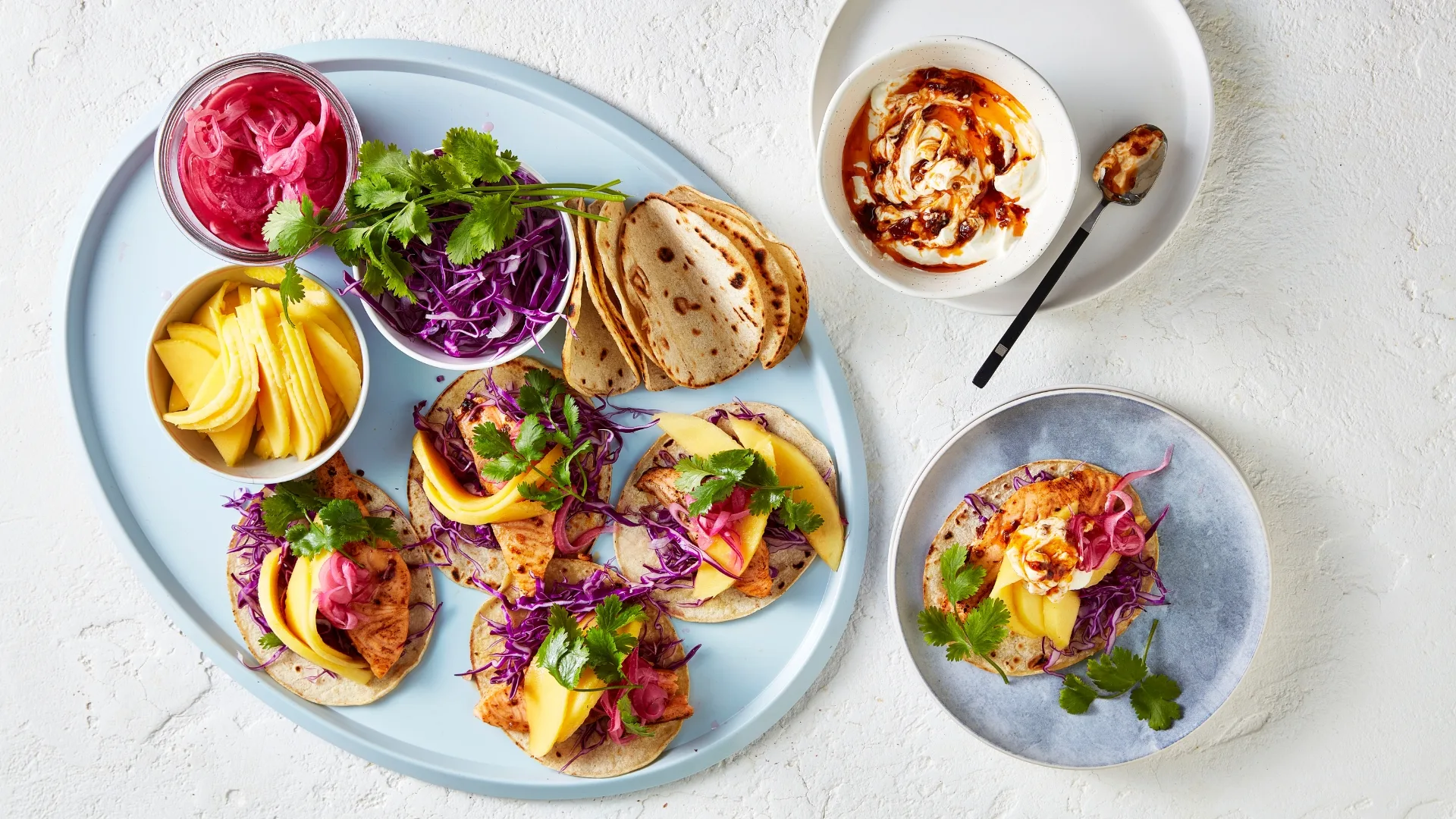 This colourful spread is the perfect way to brighten your day. Bowls of yellow Calypso® mango, pickled red onion, and purple shredded cabbage form a rainbow when wrapped in warm tortillas. It’s a quick and easy recipe that’s fun for the whole family.
