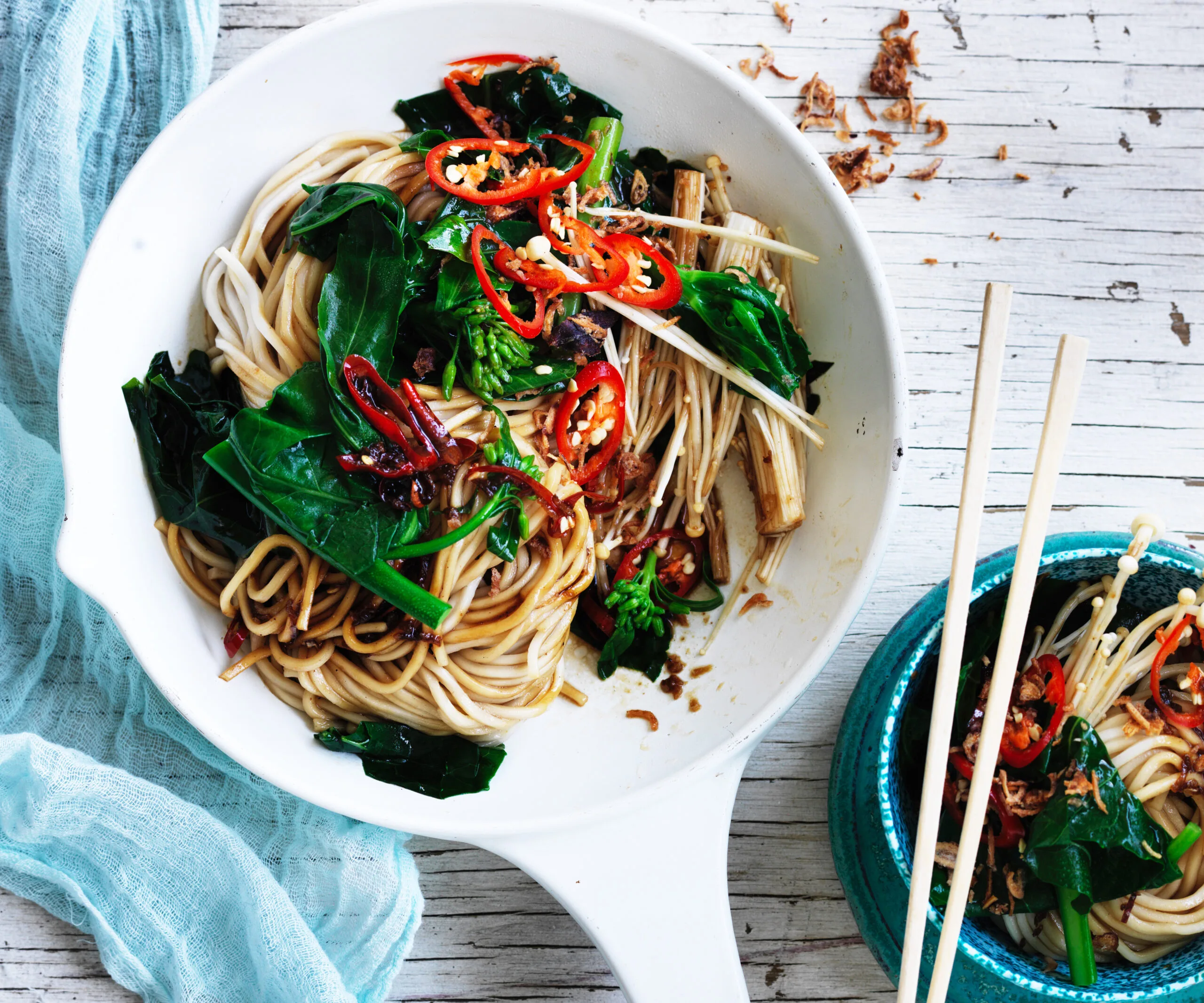 Gai lan (or Chinese broccoli), enoki mushrooms and udon noodles combine for a delicious vegetarian stir-fry.