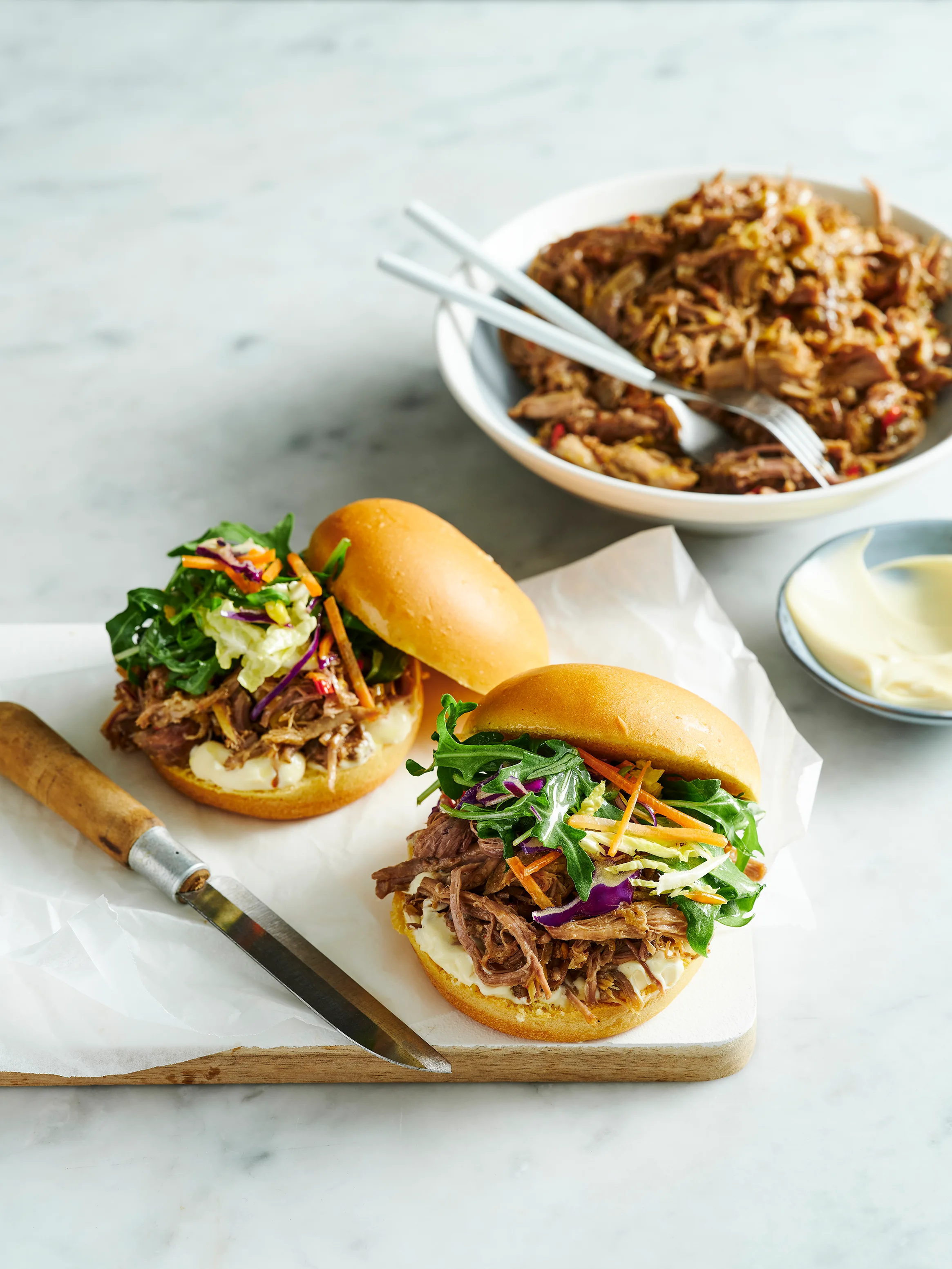 Shred the pork with two forks. Serve pork with brioche buns, mayonnaise and dressed salad.